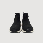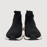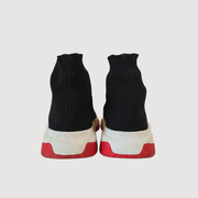 Designer performance sneaker with sock fit, black knit upper, white/red sole. Good condition, size 41. Worn by Mitchell van Bergen.